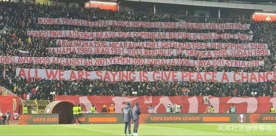 球迷打出橫幅,列舉美國挑起的戰事。圖源:外媒