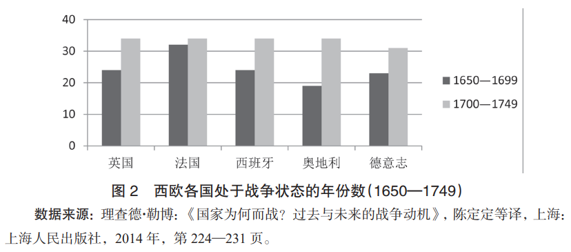 歐洲各國軍事力量增長和戰爭的邊際成本下降,加劇了國際競爭。率先在軍事技術變革中獲得相對優勢的國家會更加傾向於使用武力。歐洲出現了螺旋式的軍備競賽,各國軍隊規模不斷擴大。1702—1714年間,法國有10%的適齡人口參加正規軍;七年戰爭期間普魯士的參軍適齡人口則達到了25%。當法國的軍隊人數高達20萬時,奧地利、普魯士和俄羅斯只能隨之擴軍,其他小國也被迫效仿。頻繁的戰爭是競爭加劇的重要標誌。圖2展示了西歐主要國家在兩個時期處於戰爭狀態的年份,第一個時期大約是從1648年威斯特伐利亞體系確立到1699年之間,第二個時期則是從1700年西班牙王位繼承戰爭爆發到七年戰爭前夕,兩個時間段都接近50年,而第二個時期西歐主要大國的戰爭頻率明顯高於第一個時期。1740年奧地利王位繼承戰爭爆發後,戰爭形式發生了重大變化,普魯士和奧地利從有限戰爭逐漸轉向全民動員,開始了以民族國家為單位的戰爭,進一步增加了國際競爭的烈度。