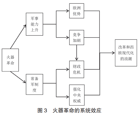 如圖3所示,火器革命帶來的多重系統效應,通過複雜的機制對西歐現代化起到巨大的促進作用。**火器技術的革新帶來了武器生產和戰爭形式的標準化,它對於國家的現代化具有兩種不同方向的外部性:正外部性是標準化生產和步兵方陣等戰術,意味着國家在軍事上只能依靠常備軍,由此強化了中央權威,有利於國家的現代化轉型;負外部性是加劇了西歐內部的競爭,給國家財政帶來巨大負擔,從而使王室受制於傳統貴族而難以推進改革。**到18世紀中期,不斷增強的競爭和危機感促進了西歐各國精英的覺醒,他們試圖藉助得到強化的中央權威來推行被稱為“開明專制”的改革運動,從而開啓了改革和現代化的浪潮。