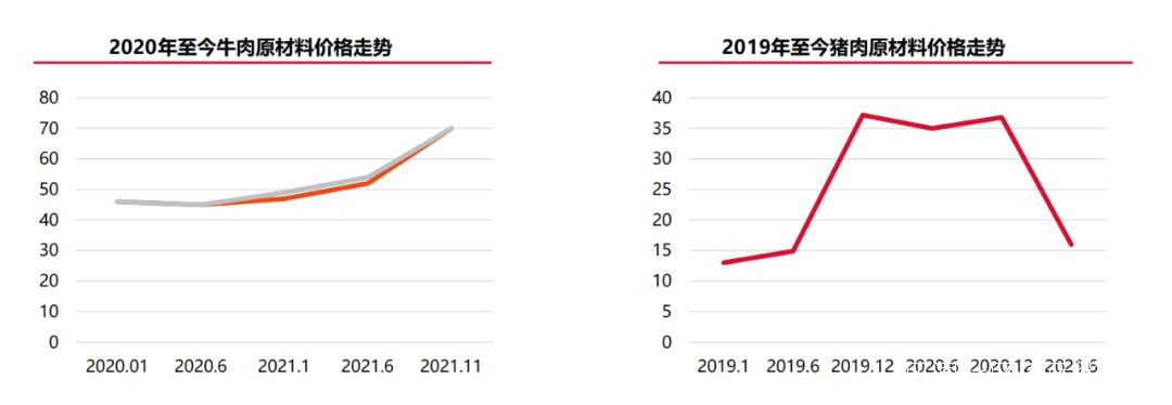 牧原股份披露的近兩年業績,就是典型的豬週期。豬週期在中國歷史上已經出現了好幾次,它的最高點跟最低點甚至差三倍。雞肉也經歷了類似的大起大跌。從歷史來看,牛肉價格很少有大幅劇烈波動,但對比去年上半年和下半年,平均上漲了40%以上。