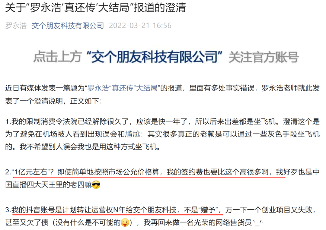 最新的動作是,3月21日,羅永浩回應了“天價分手費”的傳聞。其背後的公眾號“交個朋友科技有限公司”發佈了《關於“羅永浩‘真還傳’大結局”報道的澄清》,文中聲稱:“我(羅永浩)的抖音賬號是計劃轉讓運營權N年給交個朋友科技,不是‘贈予’。”而1億元“分手費”則不屬實,“即使簡單地按照市場公允價格算,我的簽約費也要比這個高很多啊。”