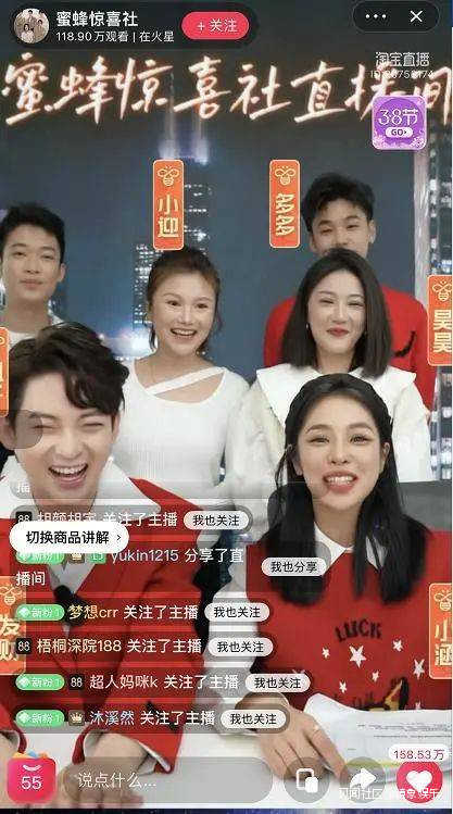 具體而言,一方面,與“薇婭驚喜社”高度相似的“蜜蜂驚喜社”不久前開播,主播團有6人,其中5人是薇婭直播的助播。儘管從運營主體上還看不出兩個直播間之間的關聯,但兩者在主播和直播風格上高度相似,只是直播不再以某個主播為主,而是多主播輪流上場,背後的運營邏輯已然不再是孵化超級主播。