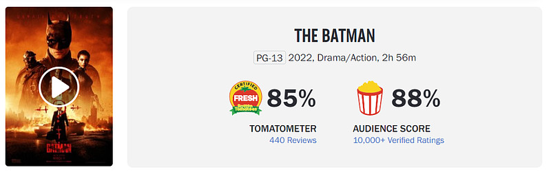 從口碑來看,《新蝙蝠俠》的爛番茄新鮮度達到85%,低於《蝙蝠俠:黑暗騎士》(94%)但與另兩部諾蘭作品相仿,且遠高於《蝙蝠俠大戰超人:正義黎明》(29%)和院線版《正義聯盟》(40%),當然扎克·施奈德重剪的《正義聯盟》風評稍好(71%)。同時《新蝙蝠俠》也獲得入場影迷的肯定,在CinemaScore上的得分達到A-。從觀眾構成看,《新蝙蝠俠》的購票人羣中男性佔比達到65%,而且60%為18到34歲的年輕受眾。