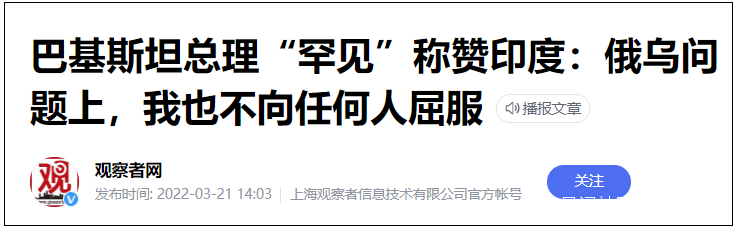 據巴基斯坦《論壇快報》報道,伊姆蘭·汗20日在開伯爾-普赫圖赫瓦省達爾蓋鎮(Dargai)發表演講,他在談到俄烏問題時表示,印度不顧美國的制裁,也不顧自己是美國的盟友,堅持從俄羅斯進口石油。讚揚印度擁有“獨立外交政策”。