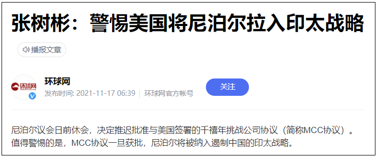 還有,前段時間尼泊爾為了獲得美國5億美元的援助和美國簽訂了一個出賣國家主權的“千禧年挑戰計劃”協議(MCC)——在MCC 協議的第7.1節明確寫道:“締約雙方理解,合約一旦進入實施,其效力大於尼泊爾當地法律。”