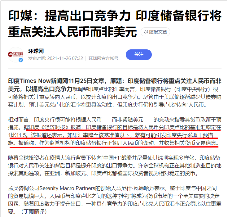 2021年11月的時候,印度央行就發佈一則公告:印度儲備銀行的目標是將人民幣兑印度盧比的基準匯率定在1比11.5,如果匯率降至該基準值以下,就有可能引發印度央行採取干預措施,作為監管機構的印度儲備銀行正緊盯人民幣的變動,並收集相關貨幣交易信息。