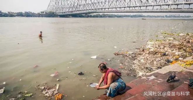 印度加爾各答的豪拉大橋下,有人用河水洗澡洗菜洗碗