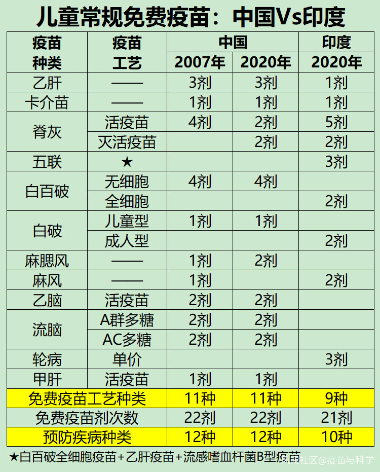 一沒想到,印度居然已經在免費疫苗裏用上了五聯疫苗,中國最多只用到了三聯疫苗(麻腮風/或白百破)。中國有一個自費的國產四聯疫苗,五聯疫苗只有進口產品。