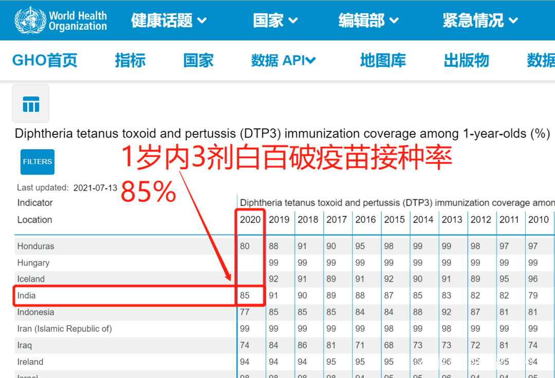 不過,需要考慮接種率。中國兒童免費疫苗的接種率接近100%,但印度沒那麼高,世界衞生組織網站查典型疫苗——白百破疫苗的接種率,2020年中國是99%,印度是85%。