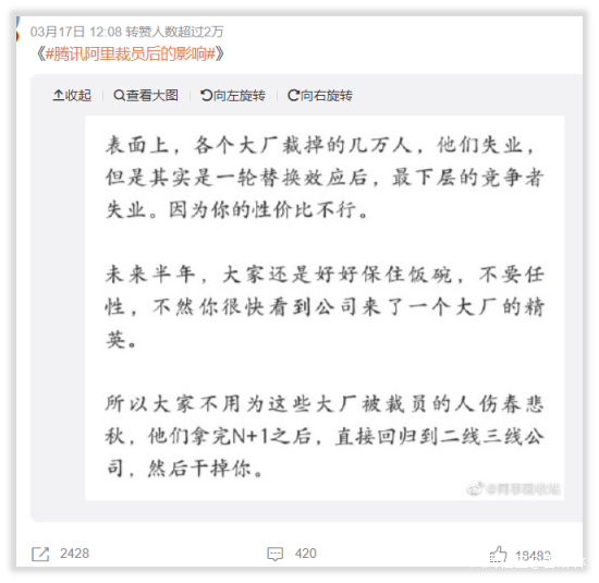 伴隨着小道消息的情緒渲染,人人自危,生怕大廠帶動了裁員潮,下一個就輪到自己。