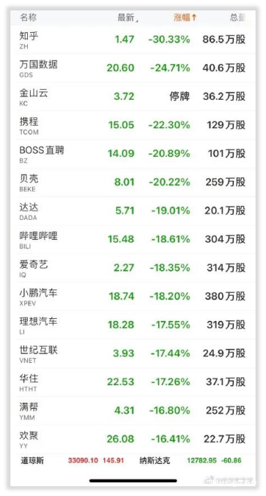 知乎跌了30%,B站跌了近20%,愛奇藝、小鵬汽車、貝殼、BOSS直聘、攜程,統統在一天時間裏跌掉了自己1/5的市值。