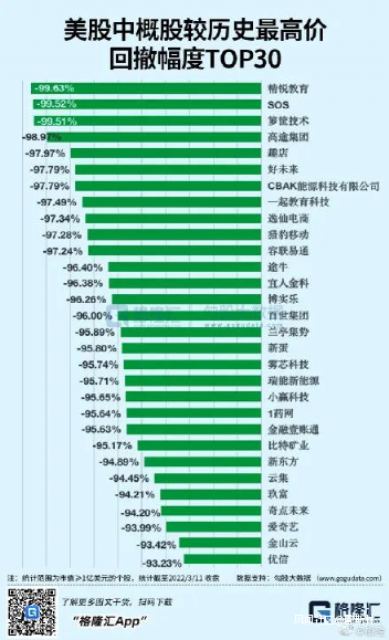 有人整理了截止於3月11日,中概股較歷史最高價回撤程度排名: