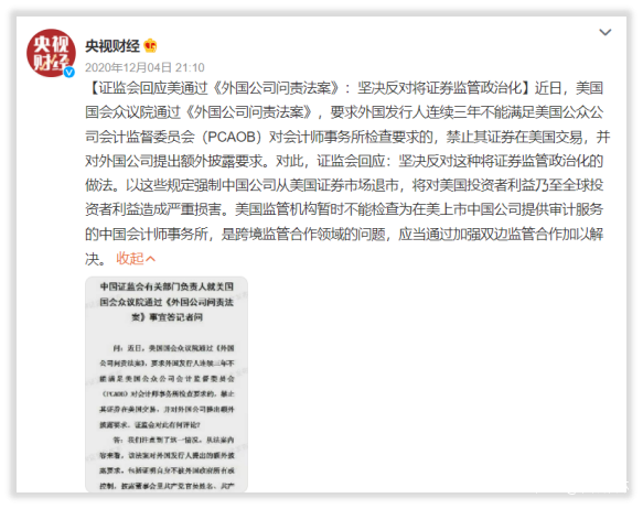 結果到了2020年末,美國證券交易委員會(SEC)通過了《外國公司問責法案》。次年3月,其最終修正案通過。
