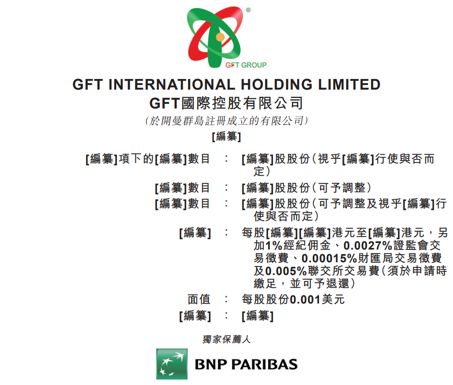 據港交所披露,GFT國際控股有限公司(以下稱“GFT國際”)遞表港交所,法國巴黎銀行為其獨家保薦人。
