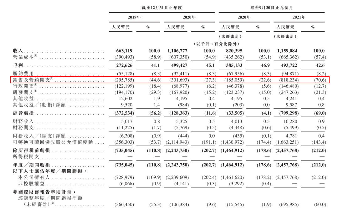 如上圖所示,2019 年和 2020 年,Keep 的營銷費用分別為 2.96 億元和 3.02 億元,佔 Keep 同期收入的 44.6% 和 27.3%。但在 2021 年前三季度,Keep 的營銷費用大幅增至 8.18 億元,同比增幅超過 340%,佔同期總收入的比例也達到 70.6%,遠超 2019 年和 2020 年。