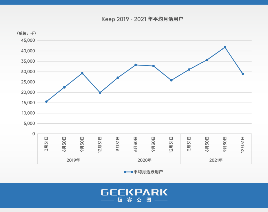 根據招股書,2019 年、2020 年、2021 年 Keep 的平均月活分別是2177 萬、2973 萬和 3436 萬。2020 年和 2021 年平均月活的同比增速分別是 36.57% 和 15.55%。其中最高的 2021 年 Q3,Keep 在該季度平均月活突破 4000 萬。
