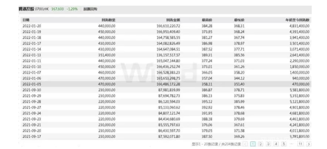 2021年9月至今騰訊控股回購股份數據