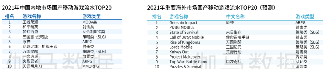 2021年中國內地和海外市場國產遊戲流水TOP20