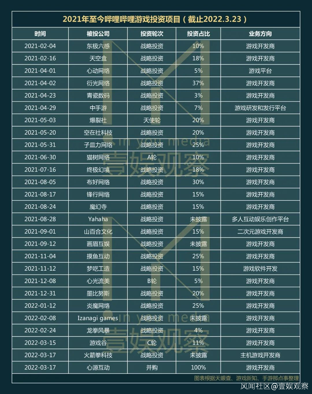另一方面,壹娛觀察(ID:yiyuguancha)也進一步整理了2021年以來,B站在遊戲方面的外部投資,三十多次毫不猶豫地出手,足以證明B站在遊戲方面的寄予厚望。