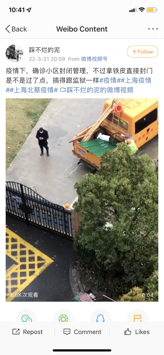 微博用户@踩不爛的泥,在3月21日上傳了有關上海北蔡因疫情鐵皮封門的視頻。