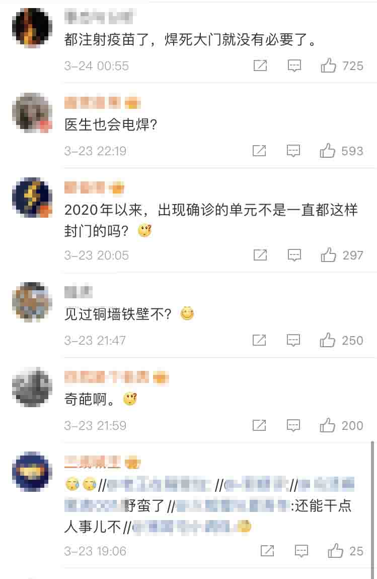 視頻中看到有身着防護服人員使用焊槍將小區單元門焊死,不知道是否有些做得過火了。