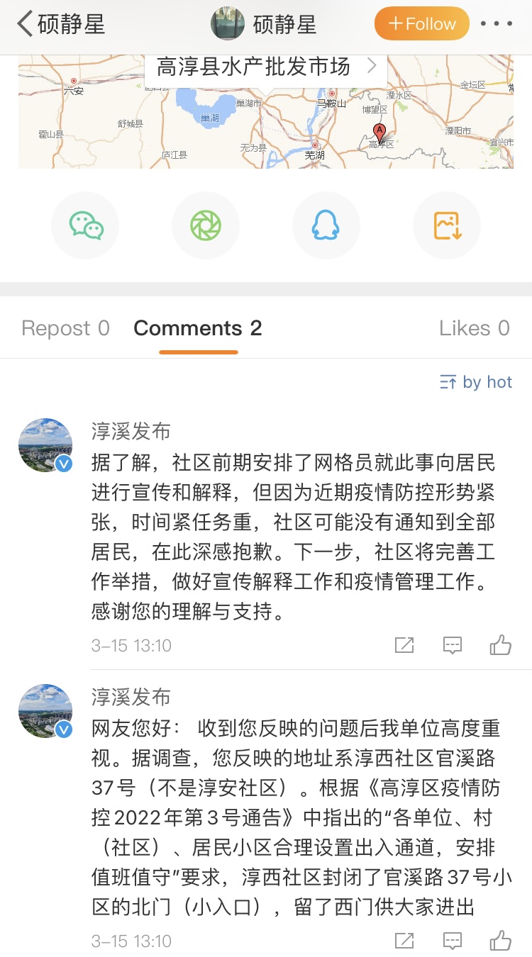 在微博用户@碩靜星上傳的這條視頻下面的評論區,我看到了官方@淳溪發佈對疫情封門的回應: