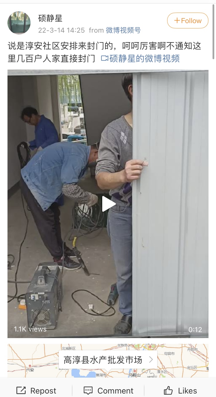 微博用户@碩靜星,在3月14日上傳了有關南京淳安社區封門的視頻。