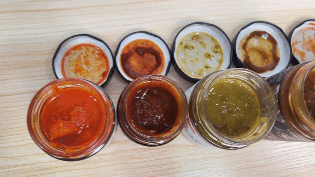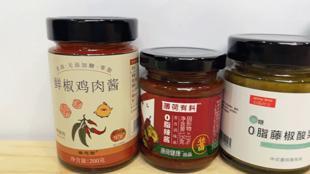 ▲從左到右依次:醬總管鮮椒雞肉醬、薄荷健康0脂辣醬、低脂時光0脂藤椒酸菜醬、獨角獸暴肌廚房低脂黑椒牛肉醬、椒達人0脂辣椒醬、老乾媽精製牛肉末豆豉油辣椒