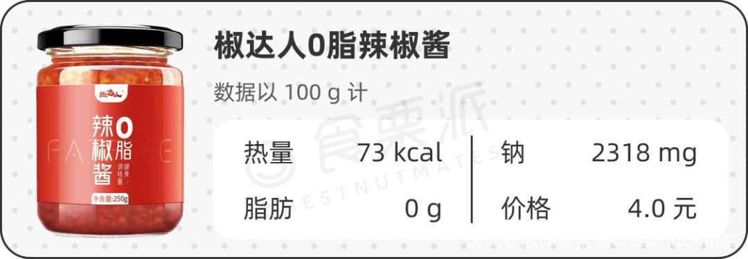 60款低卡拌飯醬的平均熱量只有老乾媽醬料的14%,低脂時光的0脂藤椒酸菜醬的熱量只有26kcal/100g,1大瓶(200g)的熱量才52kcal,和半個蘋果(100g,54kcal)的熱量差不多。