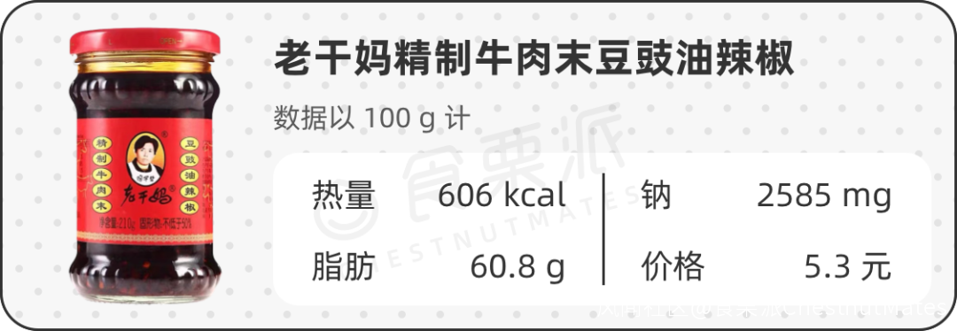 60款低卡拌飯醬,平均每100克有4g多鹽,而老乾媽拌飯醬的鹽有6g/100g,確實低了一些,但也是高鹽食物。