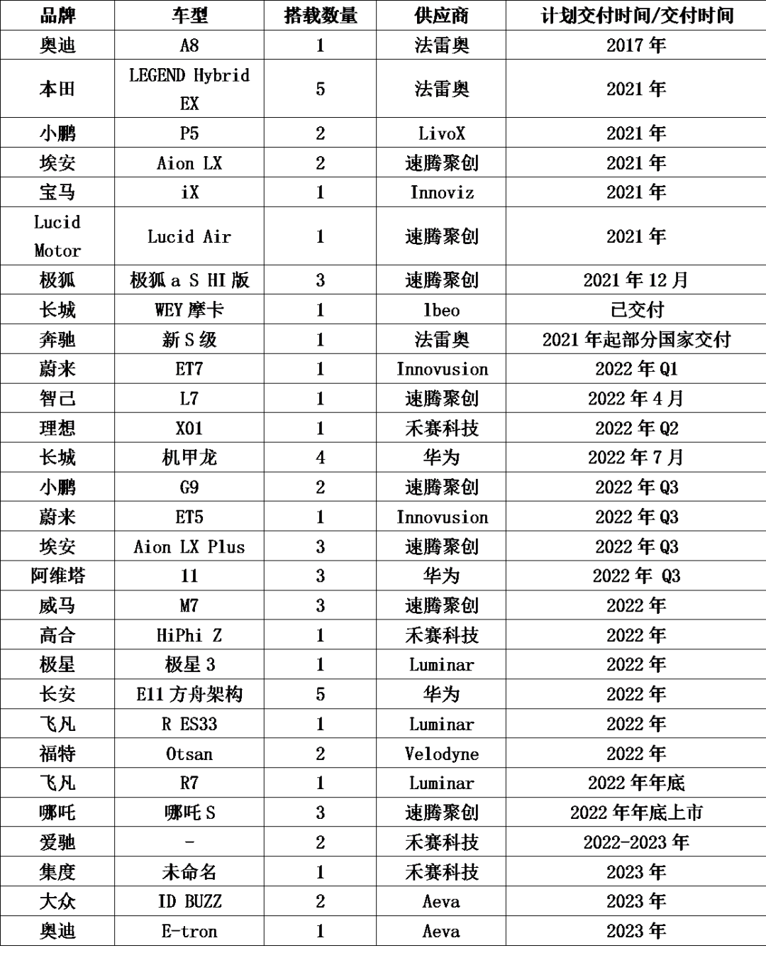 ▲ 近期搭載激光雷達的車型及其供應商