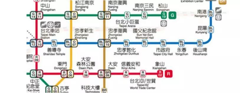 從最左邊的“善導寺”開始,往東走,你會發現越走越迷茫。先是遇到“忠孝新生”,然後是“忠孝復興”,再來是“忠孝敦化”。我那時不禁納悶,搭乘地鐵還要搞這些?究竟要“忠誰”,“孝誰”,“助誰復興”?直到我們繼續往東走,一切豁然開朗。下一站,“國父紀念館”,OK!明白了!哈哈哈。原來捷運網絡圖還搞主題的。牛逼。