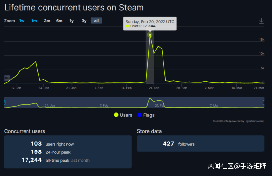 同樣來自SteamDB的數據表明,《Battlebit Remastered》在今年一月底的開放測試中的在線峯值逼近8000,雖然這次的測試很快結束,但在二月份的又一輪測試中,這個數據翻了個倍,遊戲同時在線人數超過1萬7千人,也就是説在當時有將近兩萬人同時在玩這個遊戲,而這已經是《戰地2042》日在線峯值的十倍了。