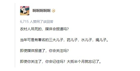 這不是説農村老人自殺的問題不必關注,但很顯然大多出於經濟原因而自殺的農村老人,跟很多在經濟上壓力不大,卻大都因為精神、政治等原因而自殺的藝術家,顯然不是一回事。強行把這二者作類比,説農村自殺的人比作家多,這除了傻逼還是他媽的傻逼。