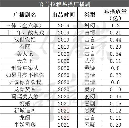 喜馬拉雅作為穩居第一的音頻綜合類app,截至2021年6月30日,平均月活躍用户達到了2.6億。喜馬拉雅在廣播劇上有兩個方向,其一是接洽影視網文大IP,撬動高流量;其二是發揮自身在有聲書上的優勢,向廣播劇引流轉化。除了搭上了《三體》這個科幻大IP之外,《雙世寵妃》《有匪》《琉璃美人煞》《贅婿》《半妖司藤》等影視IP在廣播劇頻道也十分受歡迎。