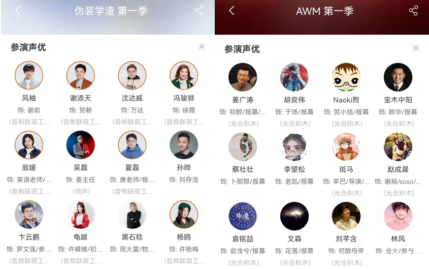 在創制模式上,貓耳FM以PGC為主,將已授權作品分包給專業工作室,為優質IP尋找最合適的聲音表達者。如《偽裝學渣》的CV來自參與過《我為歌狂》《秦時明月》等高人氣動畫配音的音熊聯萌工作室;《某某》的CV則有不少都來自聲優天花板的邊江工作室;《AWM》由資深配音演員姜廣濤創建的光合積木聯合出品。