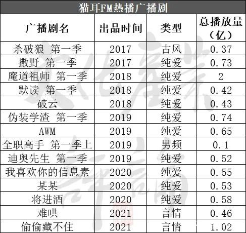 貓耳FM是市場主流音頻平台中主打廣播劇的垂類音頻平台,至今已經推出瞭如《魔道祖師》《撒野》《默讀》等精品廣播劇,憑藉獨一無二的耽美文化和純愛元素聚集了具有較高穩定性和活躍度的二次元用户。2017年其出品的古風廣播劇《殺破狼》正式開啓商配廣播劇的先河,全三季付費價格分別為19.9、29.9、39.9,播放量均超過3000w,展現了不俗的市場號召力。