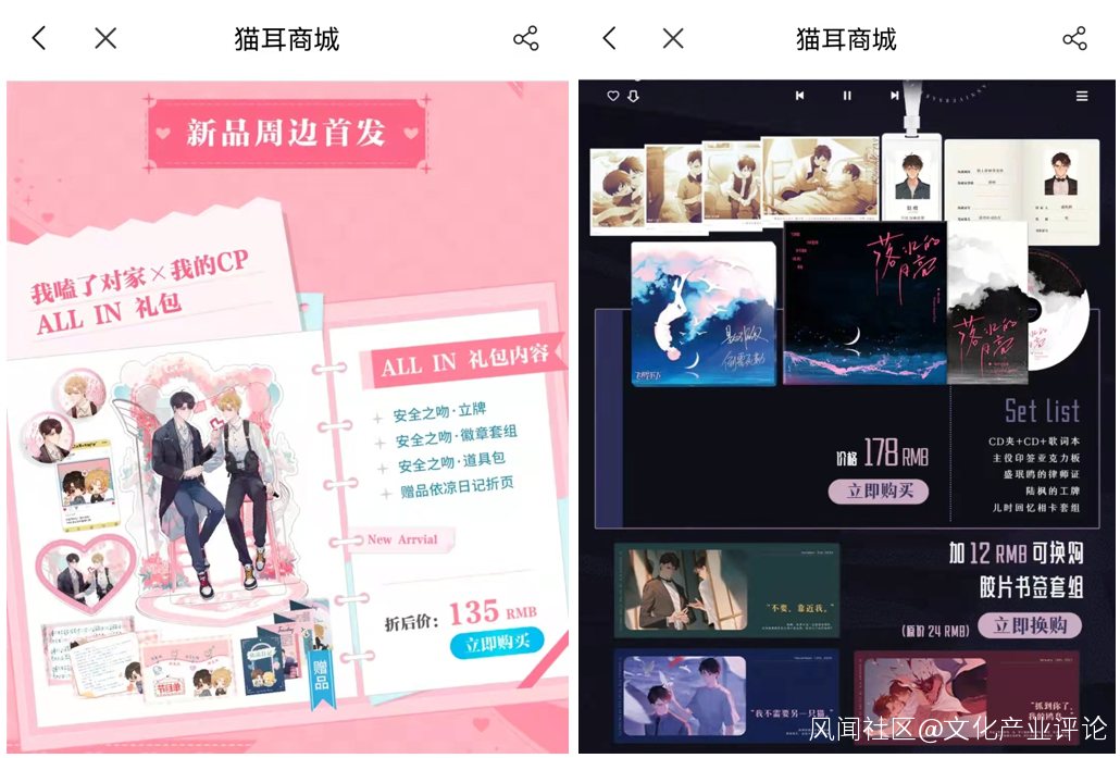 在全產品開發上,貓耳 FM一方面將熱播廣播劇中的人物聲音製作成啓動音、鈴聲、運勢語音等,匹配用户多元化的場景需求;另一方面則開設了“貓耳商城”,出售廣播劇人物手辦、紀念套裝、家居文創等,把虛擬聲音匯聚的流量導入實體產品。