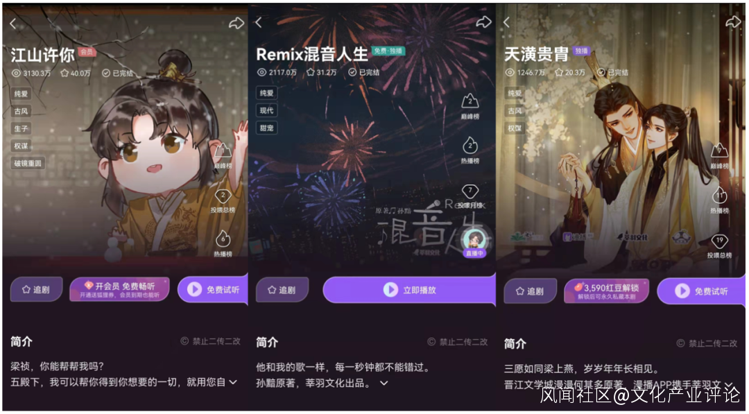 時至今日,各平台已經打響了廣播劇之戰,從內容IP、聲優孵化、創制團隊到付費模式,每一個環節的探索和完善都影響着平台在這一賽道的收益和未來增量。