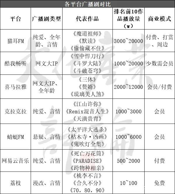 為了清晰地看到各個音頻平台的廣播劇創作特點和商業模式,筆者梳理了以下表格。