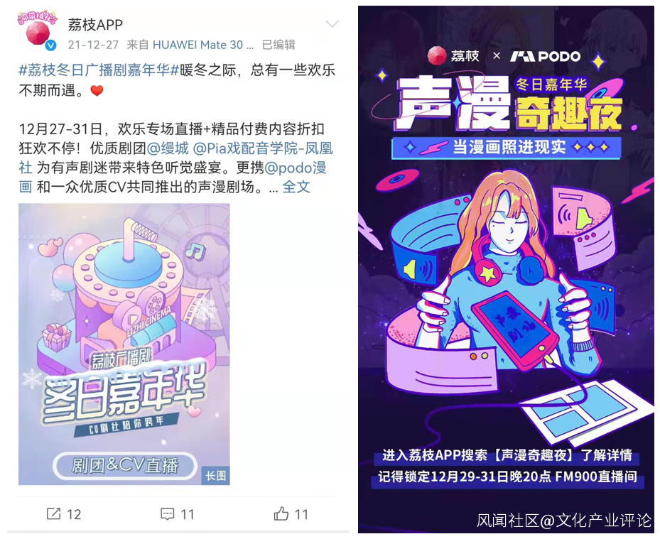 另外一個線上音頻佼佼者荔枝FM在廣播劇領域則甚少有參與感,雖然有《桃李不言》《合久不分》《70,80,90》等百合廣播劇,但是其播放量都未達百萬。2021年底,荔枝還發起了#荔枝冬日廣播劇嘉年華#的活動,通過優質劇團與漫畫IP打造聽覺盛宴,從中能看到荔枝發展廣播劇的野望,但目前收效尚未明朗。