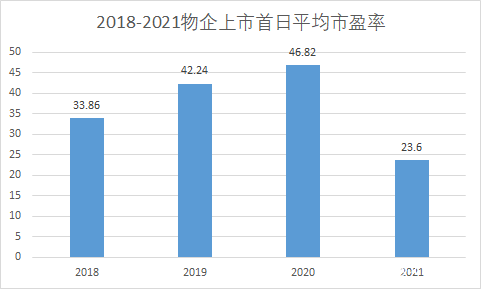 我們來看下從2018年到2021年的物企上市首日平均市盈率來看,2020年平均首日市盈率達到了46.82,歷史最高。