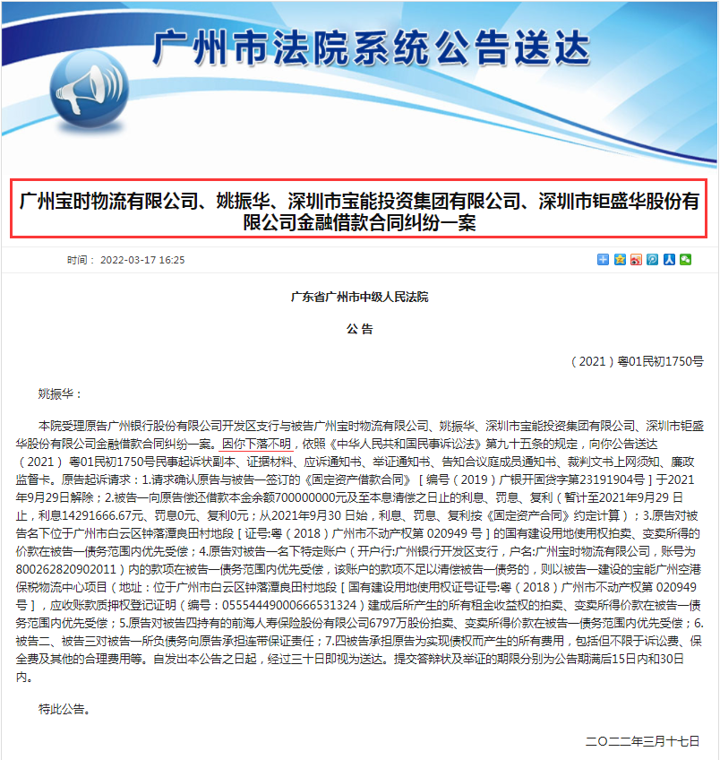 廣州中院在3月17日發了一則通告,稱因為姚老闆下落不明,一筆借款糾紛的法律文件,只能以公告的形式發出來。