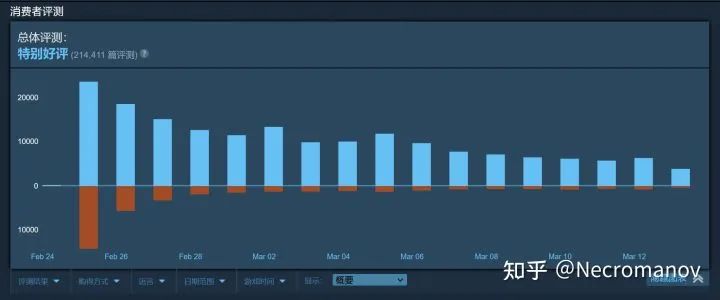 從數據上你能明顯看到,隨着他們遊戲進度的推進,絕大多數玩家迅速地從差評方轉向了好評方,並堅定地將好評比率鎖定在了優勢位置,而在這個過程之中評論數和銷量甚至仍然在一路上漲。如果去掉前三天的差評,數據已經到達了好評如潮的標準。發行商Bandai Namco公佈,法環首月銷量已經超過了1200萬套(日本超過100萬套)。