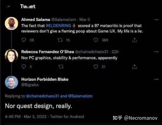 育碧斯德哥爾摩(在開發《阿凡達》)的用户體驗總監Ahmed Salama在推上抨擊了遊戲的用户體驗設計,而地平線2的任務設計師則回覆法環沒有任務設計——理所當然地,這兩位被熱情的法環粉絲網暴到打滾:你們這些做罐頭的人也敢碰瓷?