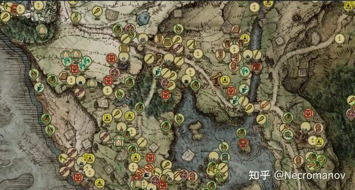 法環的開放世界到底提供瞭如何多樣的內容量?如果我們按照傳統開放世界式的引導,將和噩兆BOSS配套的寧姆格福(西區)標滿提示點,那麼這張地圖應該是下面這樣的: