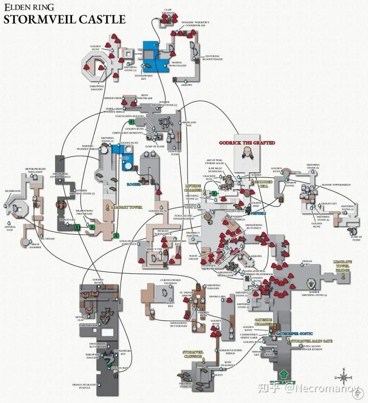 城堡一直就是宮崎英高乃至整個魂系列團隊最擅長的關卡場景,歷代作品中他們也做出了好幾個經典無比的城堡,例如惡魔之魂的王城,黑暗之魂1的王城和只狼的葦名城;但他們都沒有史東威爾城這樣龐大、難度合理、路線豐富而又高低錯落。文字描述是乏力的,而視頻攻略又是繁冗的;幸好,我在polygon站上找到了一張巧妙的拓撲攻略圖,在這裏為各位讀者引用一下,大家如果感興趣可以去原始站點看這份攻略。