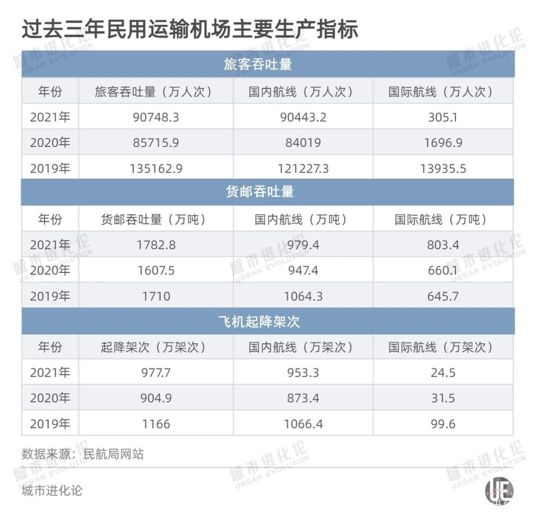 3月22日,中國民用航空局發佈《2021年全國民用運輸機場生產統計公報》:9億人次、1782.8萬噸、977.7萬架次,這是2021年我國248個民用運輸機場交出的答卷。相比疫情前的2019年,分別恢復至67.1%、124.4%、83.9%的水平。