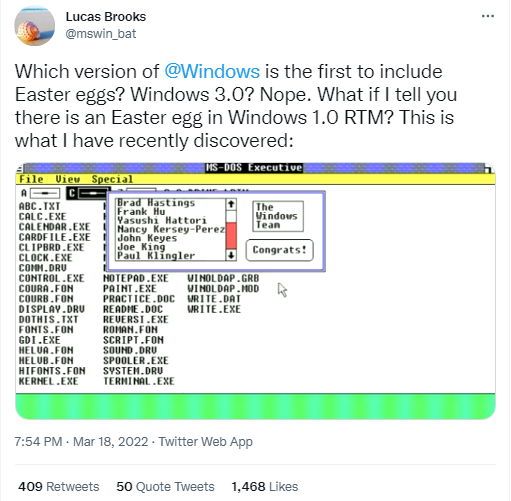 最近,Windows愛好者Lucas Brooks在自己的推特上聲稱自己找到了最古老的Windows彩蛋,同時還附上了視頻,彩蛋內容則是系統開發人員的名單。