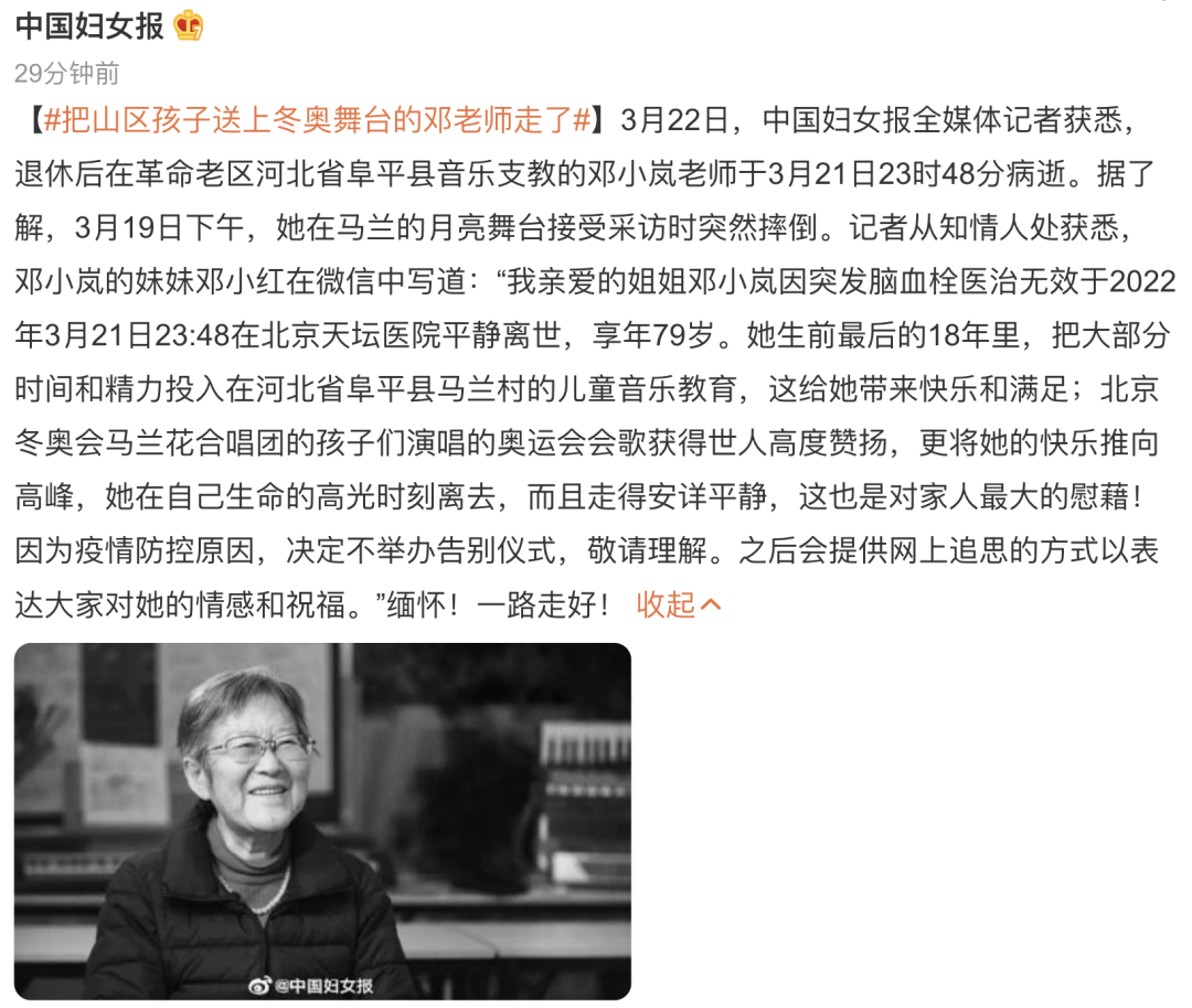3月21日晚,鄧小嵐老人去世,享年79歲。